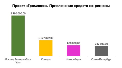 Проект «Трамплин». Привлечение средств на регионы 800,00 Санкт-Петербург 742 000,00 Новосибирск 800 392,00 177 Самара 1 , 000,00 990 Москва, Екатеринбург Уфа 2